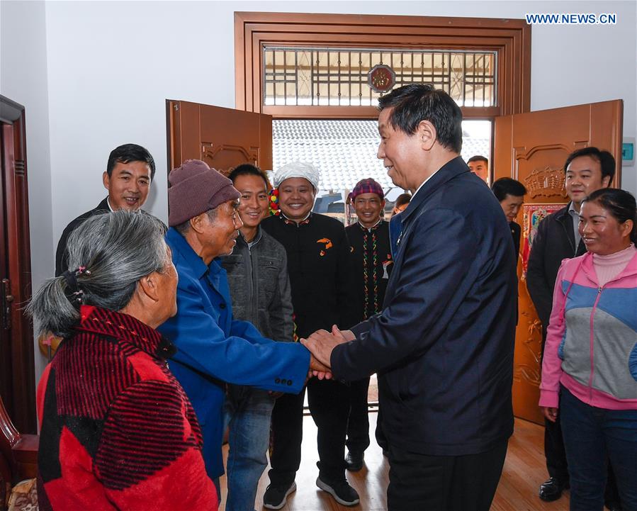 Li Zhanshu, a member of the Standing Committee of the Political Bureau of the Communist Party of China Central Committee and chairman of the National People's Congress Standing Committee, visits a villager's home at Huyu Village of Ruili City of Dai-Jingpo Autonomous Prefecture of Dehong, southwest China's Yunnan Province, Nov. 30, 2018. Li made a research on how to better make a law on basic medical care and health promotion during his four-day tour to Yunnan Province. (Xinhua/Shen Hong)