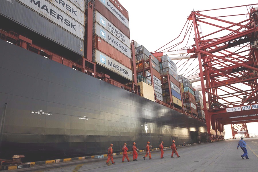 Port employees walk past a container vessel in Shanghai. [Photo/Xinhua]