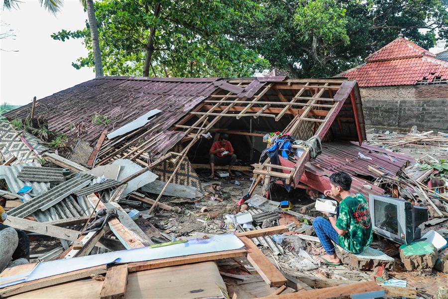 Locals have food at a damaged house in Banten Province, in Indonesia, Dec. 24, 2018. The Indonesian disaster agency on Monday put the death toll of the tsunami triggered by a volcanic eruption at 373 with 1,459 others injured, a spokesman of the agency told Xinhua on Monday. (Xinhua/Zhang Keren)