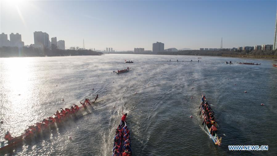 Teams of participants compete during a winter dragon boat race in Jilin City, northeast China's Jilin Province, Dec. 28, 2018. A total of 15 teams from home and abroad participated in the race on Friday. (Xinhua/Zhu Wanchang)
