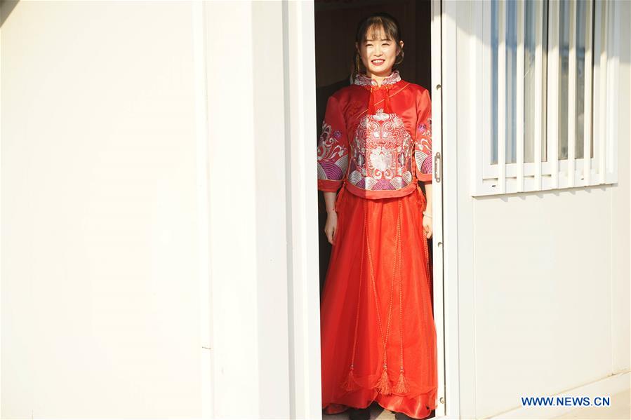 Bride Liu Yamei, a staff member of the Beijing Daxing International Airport project department, looks out at a shack at the airport construction site in Beijing, China, Jan. 1, 2019. A group wedding was held on the New Year Day at the Daxing International Airport site for the couples who have been too busy working to hold their weddings. (Xinhua/Cai Yang)