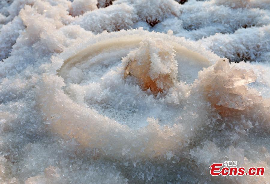 A view of the scenery of mirabilite rime on the Salt Lake in Yuncheng City, North China's Shanxi Province, Jan. 2, 2019. Mirabilite rime is formed when mirabilite crystalizes at low temperatures in the inland saltwater lake, formed about 500 million years ago and known as “China’s Dead Sea.” (Photo: China News Service/Jiang Hua)