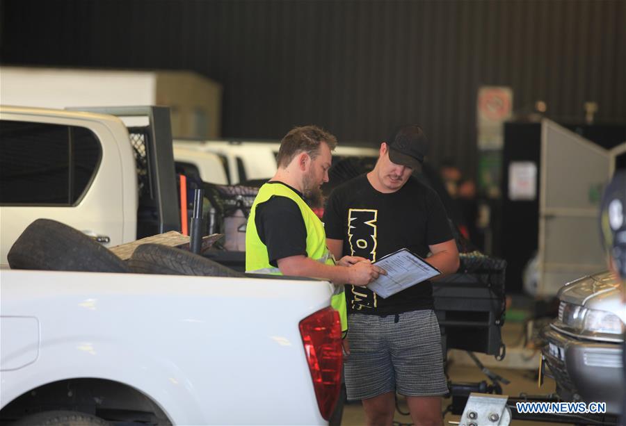 A participant registers with a staff member at the Exhibition Park during the Summernats car festival in Canberra, Australia, Jan. 3, 2019. Held annually in Canberra since 1987, this year's Summernats opened to the public on Thursday and will last to Jan. 6. Summernats has been the biggest and best-known horsepower party in Australia, and it attracts tourists to Canberra from all over the country. During the festival, people will enjoy drifting show, city cruise, burnout show and other exciting performances. (Xinhua/Pan Xiangyue)
