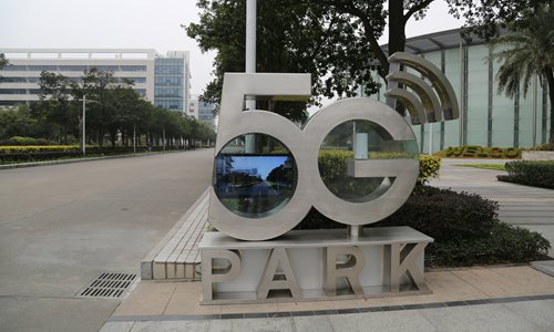 The logo for Huawei's headquarters 5G Park greets visitors to the park in Shenzhen. Photo: Chen Qingqing/GT