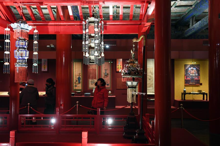 Decorative lanterns are seen at the Palace Museum, also known as the Forbidden City in Beijing, capital of China, Jan. 7, 2019. In celebrating of the most magnificent of all traditional holidays, the Palace Museum presents exhibition of "Celebrating the Spring Festival in the Forbidden City" starting Jan. 7, 2019. Hundreds of exhibits will be displayed at the museum. (Xinhua/Jin Liangkuai)