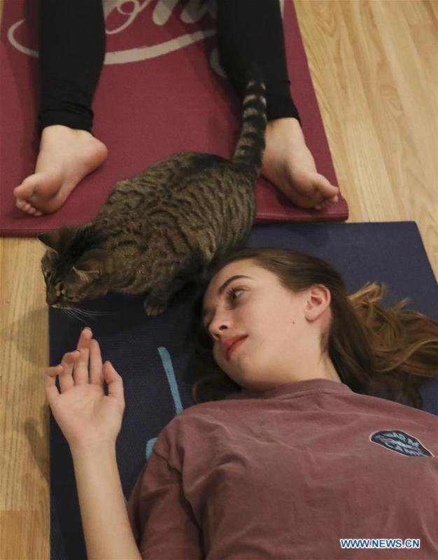 A cat is seen on a yoga participant's mat at the El Gato Coffeehouse, a cat cafe in Houston, Texas, the United States, on Jan. 6, 2019. During the Yoga with Cats class, cats walk freely among people's mats. Yoga participants said that it was a calm and fun experience with the cats. (Xinhua/Yi-Chin Lee)