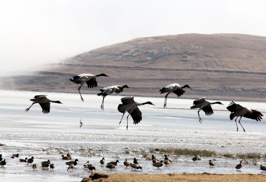 Black-necked cranes are seen at Dashanbao National Nature Reserve for Black-necked Cranes in Zhaotong city, Southwest China's Yunnan Province. (Photo by Zheng Yuanjian for chinadaily.com.cn)