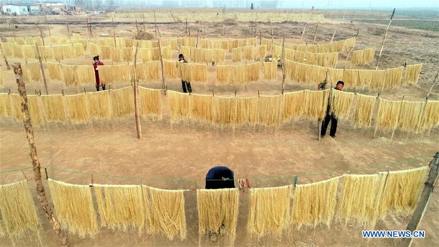 Farmers dry vermicelli in Guozhuang Village, Yanggu County, east China's Shandong Province, Jan. 7, 2019. Farmers in Guozhuang Village of Yanggu County are busy processing vermicelli to satisfy market demand as the Spring Festival approaches. (Xinhua)