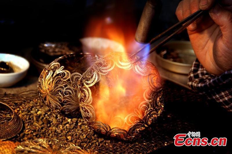Artisans use silver thread to make crafts in Chengdu City, Southwest China's Sichuan Province. The craft dates back to the Song Dynasty (960-1279) and involves time-consuming, elaborate steps to pull a one-meter silver piece into a 1000-meter thin thread, which is then used to make all kinds of handmade works. In 2008, the craft was included as a national intangible cultural heritage. (Photo: China News Service/Zhong Xin)