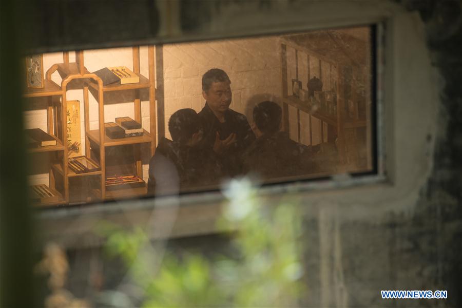 Shu Nan (C) introduces his incense products at a workshop in Miaoxi Town of Huzhou, east China's Zhejiang Province, Jan. 8, 2019. Being about 30 years old, Shu Nan is a famous incense maker who has made 50 kinds of incense products now. Shu Nan started to engage traditional incense making when he worked in a museum after graduation. He established his own incense studio in Hangzhou, Zhejiang's capital, in 2013. In 2018, he opened an incense culture exhibition hall in Huzhou. (Xinhua/Weng Xingyang)