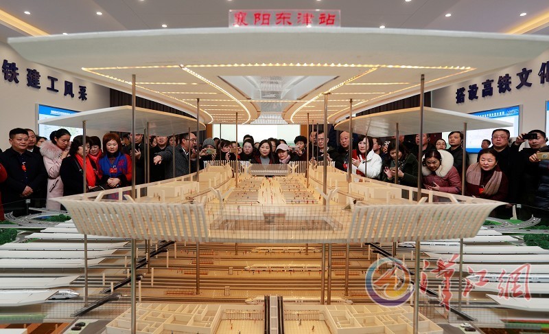 The photo shows NPC deputies and CPPCC members visiting the comprehensive support project for Xiangyang Dongjin Railway Station.