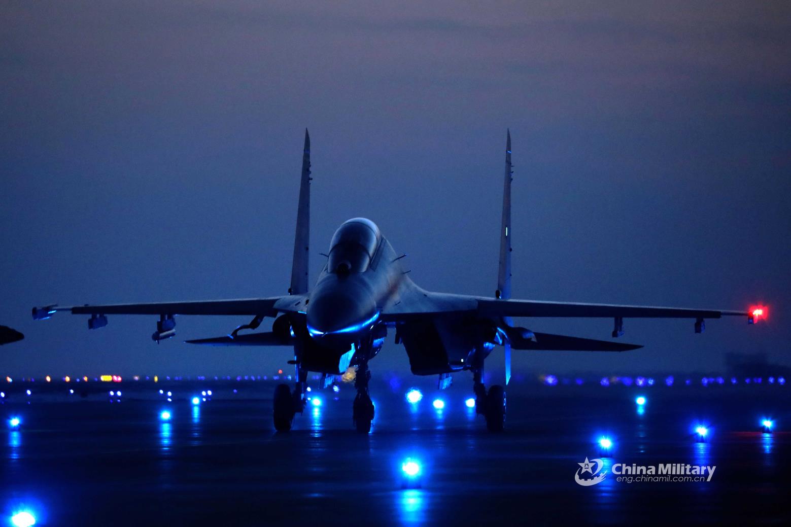 A J-11 fighter jet attached to an aviation brigade of the air force under the PLA Southern Theater Command taxies down the runway after completing a recent night flight training exercise. (eng.chinamil.com.cn/Photo by Tang Jun)