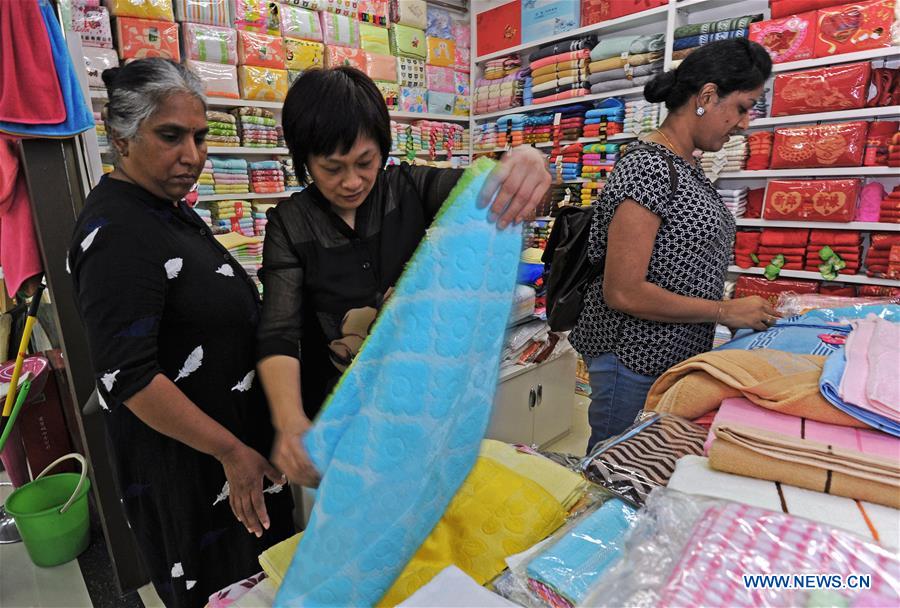 Towel vendor Xu Yanling (C) shows a bath towel to Indian purchasers at the Yiwu International Trade City in Yiwu, a city famous for selling small goods in east China's Zhejiang Province, Sept. 12, 2018. Figures released by the Hangzhou Customs showed that the trade volume between Zhejiang and countries along the Belt and Road in 2018 stood at 896.66 billion RMB yuan (132.3 billion U.S. dollars), growing by 12.3 percent year on year, accounting for 31.4 percent of the province's total foreign trade volume and 10.7 percent of China's trade with countries along the Road and Belt. (Xinhua/Tan Jin)
