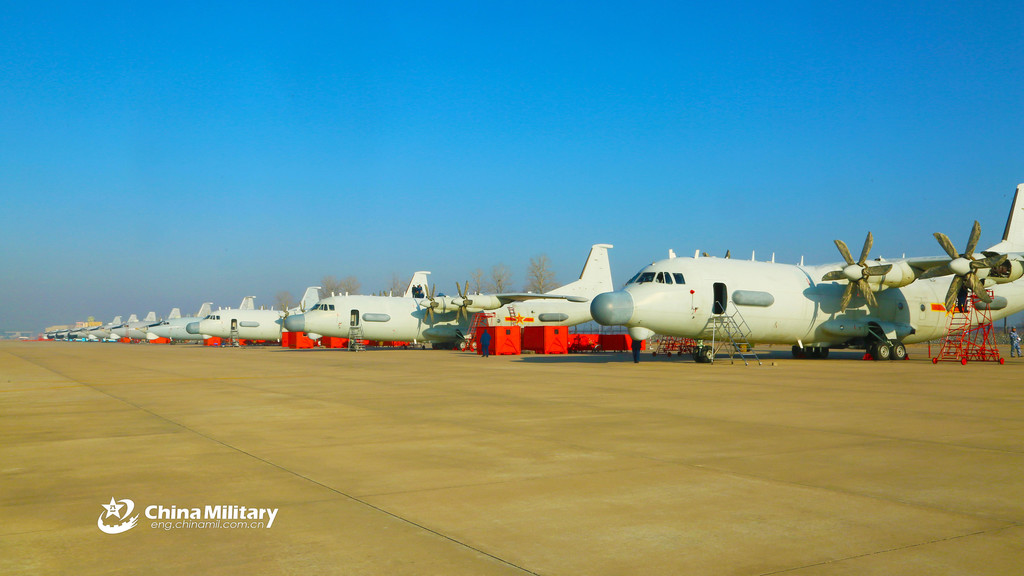 Multi-type EW aircraft attached to a naval aviation regiment under the PLA Northern Theater Command sit abreast on the flightline prior to a round-the-clock flight training exercise in early January, 2019. (eng.chinamil.com.cn/Photo by Xing Yun)