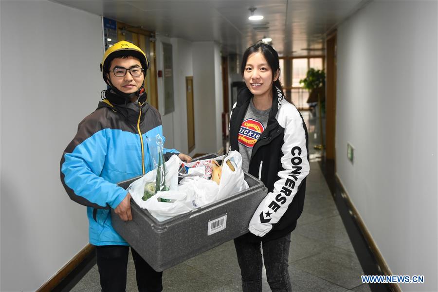Zhou Xiaoyu,(R) takes fresh ingredients for family reunion dinner on Chinese New Year Eve from a courier in Hangzhou, east China's Zhejiang Province, Feb. 3, 2019. (Xinhua/Huang Zongzhi)