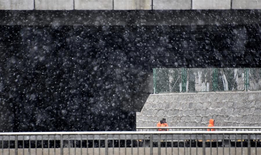 Street cleaners work in snow in Daxing District of Beijing, capital of China, Feb. 12, 2019. (Xinhua/Li Xin)