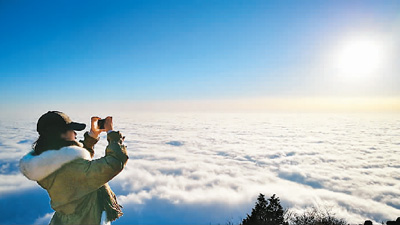 A tourist takes photos of the sea of clouds on Mount Emei in Sichuan province. (Photo courtesy of Mount Emei Scenic Area)