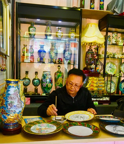 An artisan paints plates at his store at Zhongshan No 4 Road, which hosts stores and workshops devoted to Cantonese handicrafts. [PHOTO BY ERIK NILSSON/CHINA DAILY]