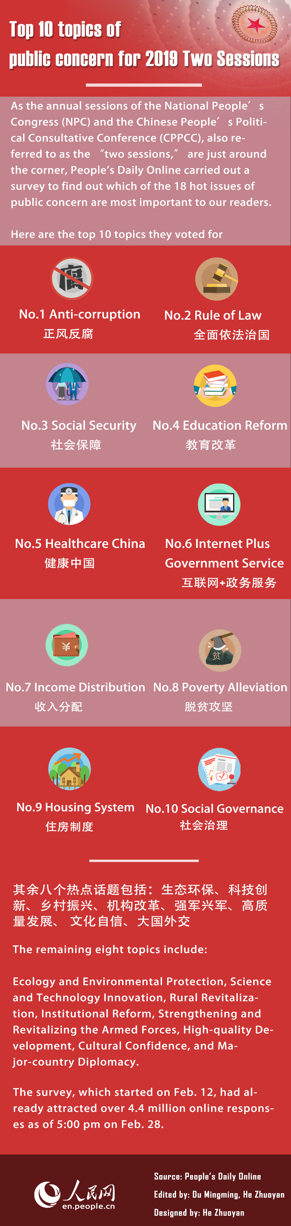 As the annual sessions of the National People’s Congress (NPC) and the Chinese People’s Political Consultative Conference (CPPCC), also referred to as the “two sessions,” are just around the corner, People's Daily Online carried out a survey to find out which of the 18 hot issues of public concern are most important to our readers.