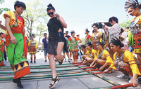 A foreign visitor joins locals in a bamboo pole dance. [Photo provided to China Daily]