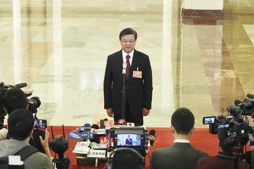 Ni Yuefeng, head of the General Administration of Customs, is interviewed at the Great Hall of the People in Beijing, March 5, 2019. [Photo/Xinhua]