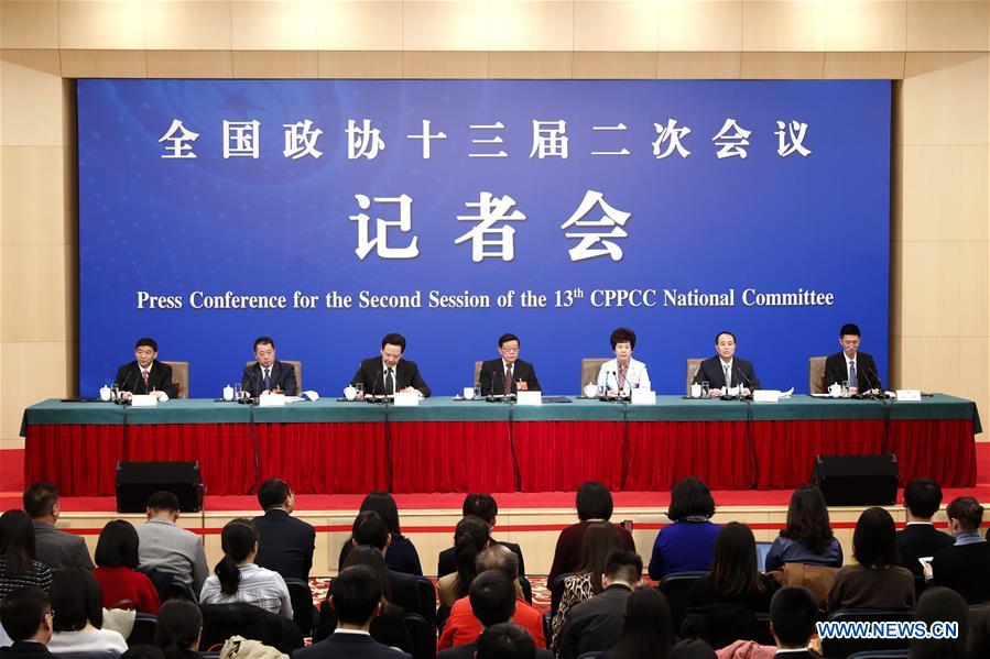 Li Wei, Qin Boyong, Chen Yulu, Wang Peian and Liu Bingjiang, members of the 13th National Committee of the Chinese People's Political Consultative Conference (CPPCC), attend a press conference on winning the three major battles of forestalling and defusing major risks, carrying out targeted poverty alleviation, and preventing and controlling pollution, for the second session of the 13th CPPCC National Committee in Beijing, capital of China, March 5, 2019. (Xinhua/Shen Bohan)