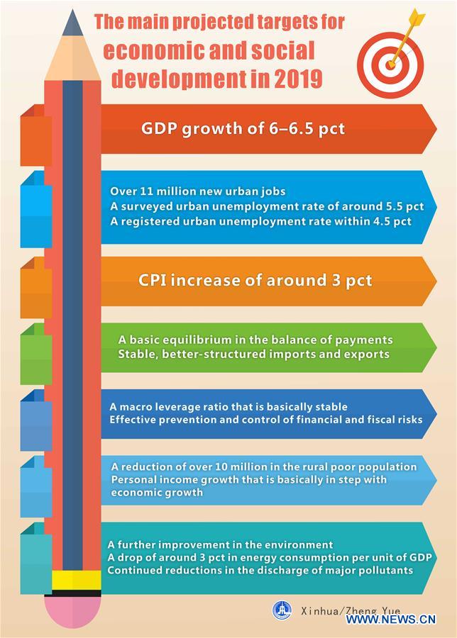The graphic shows the main projected targets for economic and social development in 2019 written in the government work report at the 2019 annual session of China's National People's Congress, which opened on March 5, 2019. (Xinhua/Zheng Yue)