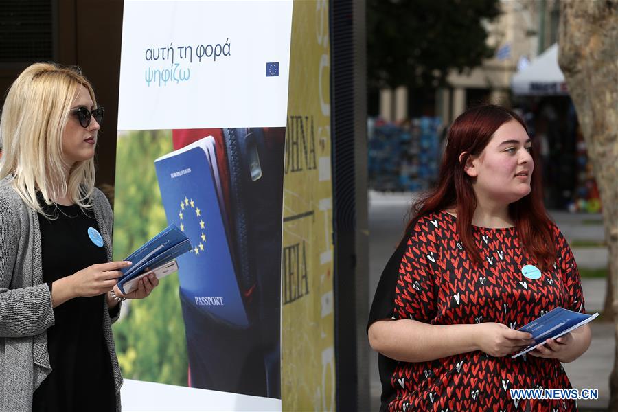 Greek volunteers hand out leaflets which contain voting information about the forthcoming European Parliament elections at Syntagma square, in Athens, Greece, on March 5, 2019. The European Parliament elections are expected to be held between May 23 and May 26, 2019. (Xinhua/Marios Lolos)