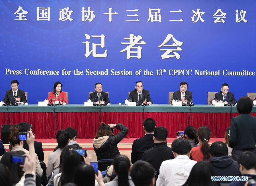 Liu Shijin, Nan Cunhui, Ye Qing, Zhou Hongyi and Zhou Qunfei, members of the 13th National Committee of the Chinese People's Political Consultative Conference (CPPCC), attend a press conference on optimizing the business environment and facilitating the high-quality development of the private sector for the second session of the 13th CPPCC National Committee in Beijing, capital of China, March 6, 2019. (Xinhua/Wang Peng)