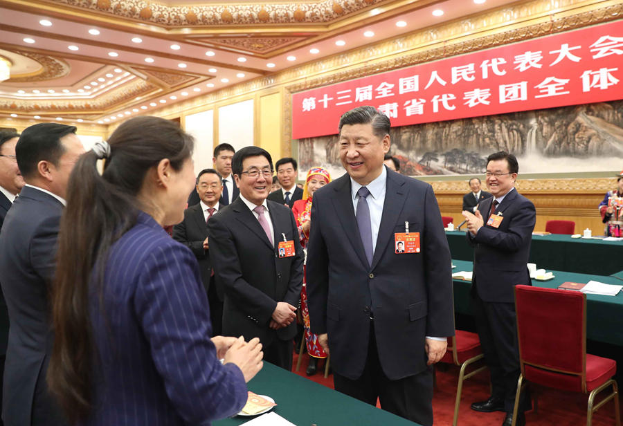 President Xi Jinping, also general secretary of the Communist Party of China Central Committee and chairman of the Central Military Commission, joins deliberation with deputies from Gansu province at the second session of the 13th National People's Congress, China's national legislature, on March 7, 2019. [Photo/Xinhua]