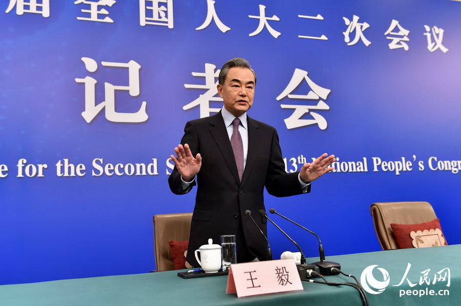Chinese State Councilor and Foreign Minister Wang Yi meets the press on the sidelines of the national legislature annual session on March 8.