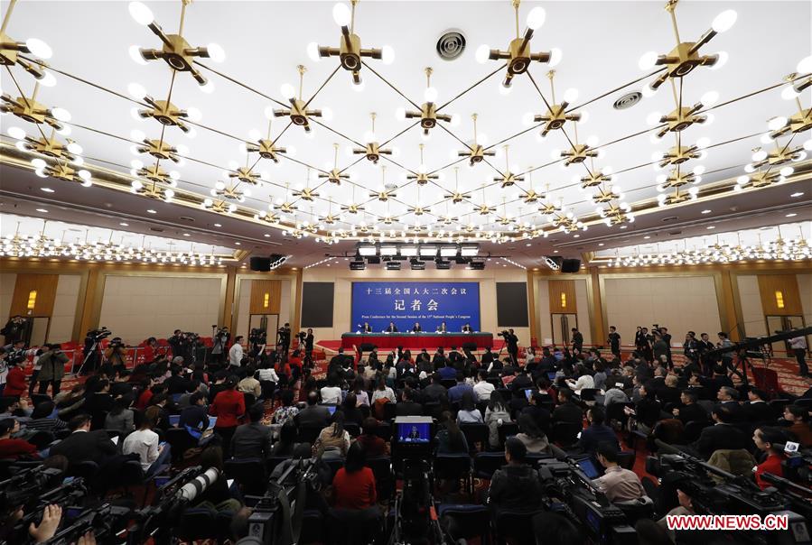 Zhang Mao, chief of the State Administration for Market Regulation, Jiao Hong, head of the National Medical Products Administration, and Shen Changyu, head of the State Intellectual Property Office, attend a press conference on "strengthening market regulation and maintaining market order" for the second session of the 13th National People's Congress (NPC) in Beijing, capital of China, March 11, 2019. (Xinhua/Shen Bohan)