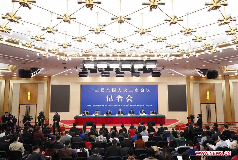 Minister of Science and Technology Wang Zhigang, Vice Minister of Science and Technology Li Meng, Director-General of Department of Strategic Planning of the ministry Xu Jing, Director-General of Department of Policy, Regulation and Innovation System of the ministry He Defang, and Director-General of Department of Resource Allocation and Management of the ministry Zhang Xiaoyuan, attend a press conference on "making China a country of innovators" for the second session of the 13th National People's Congress (NPC) in Beijing, capital of China, March 11, 2019. (Xinhua/Shen Bohan)