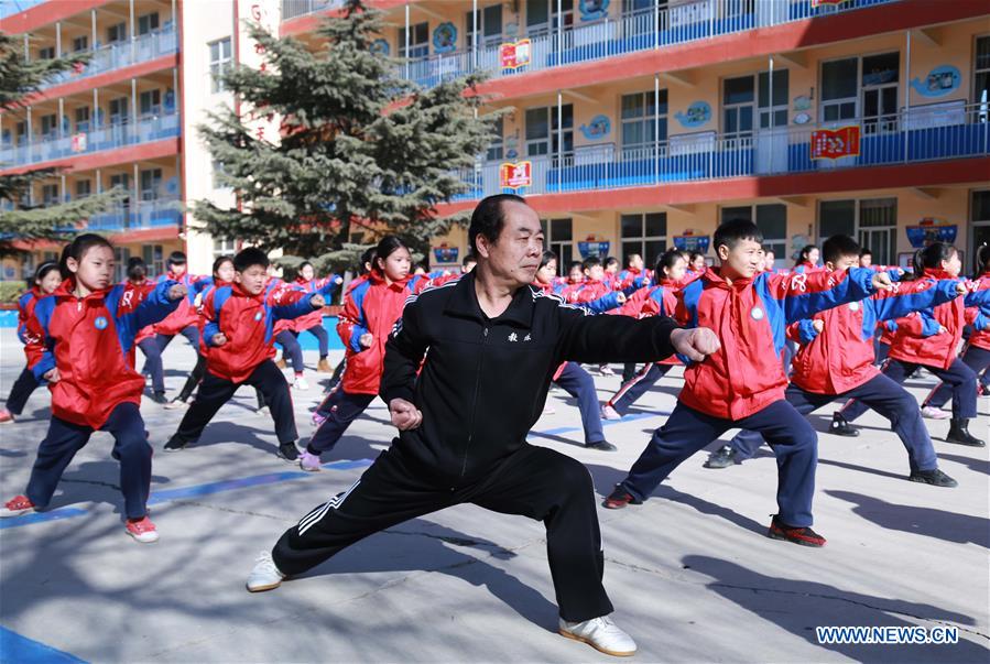 Martial art teacher Pan Siju gives guidance to students to practice Zhaquan, a form of Chinese martial arts at Dahuoquan Primary School in Qiaoxi District of Xingtai City, north China's Hebei Province, March 11, 2019. Chinese traditional martial art has been promoted in schools of Xingtai City as a sports program in a bid to preserve the traditional culture and improve students' physical fitness. (Xinhua/Zhang Chi)