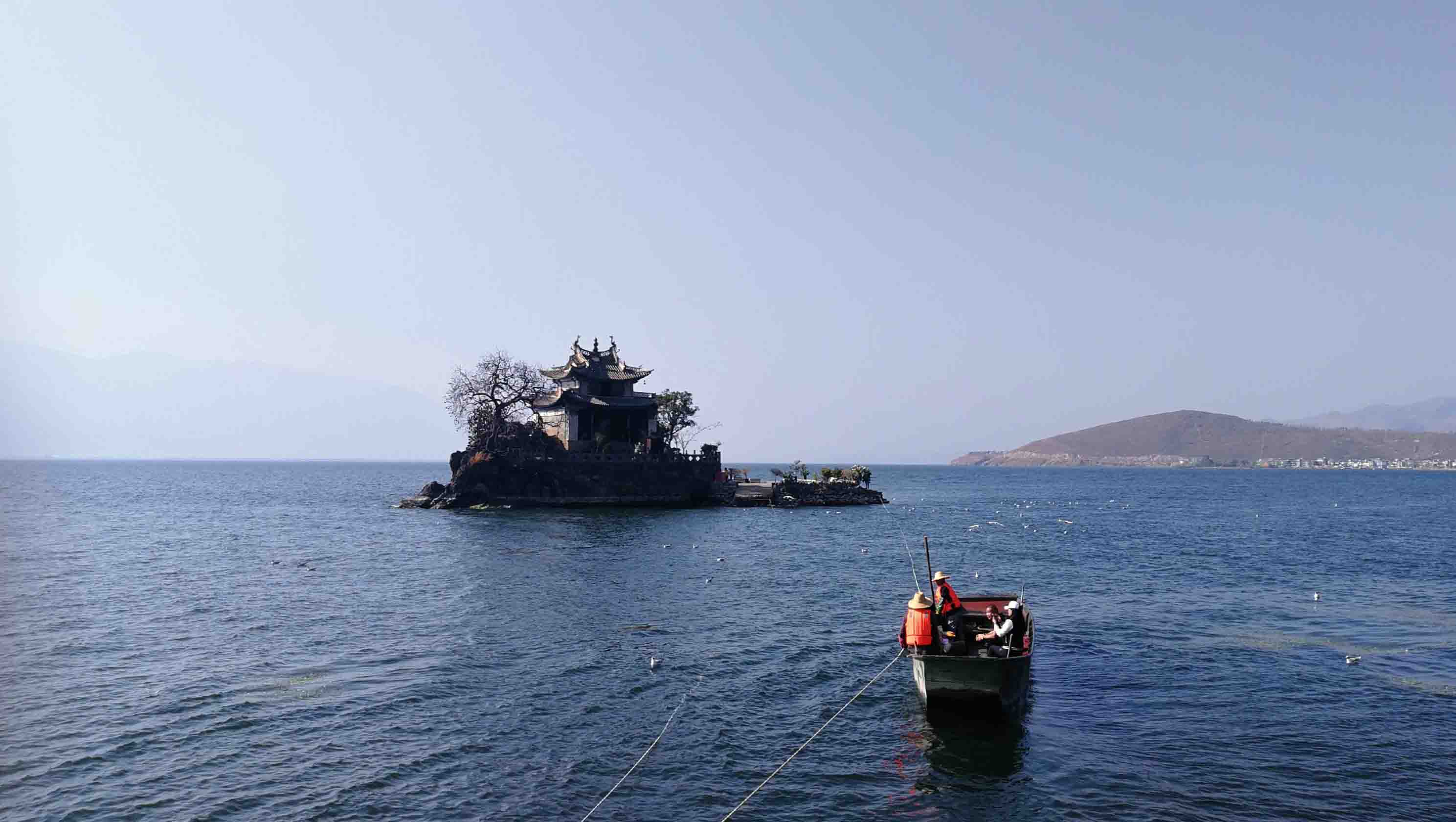 Tourists head towards Little Putuo,a tiny scenic spot on Erhai, accessed by boat using a tow rope, March 14, 2019. (People's Daily Online/Ye Ting)