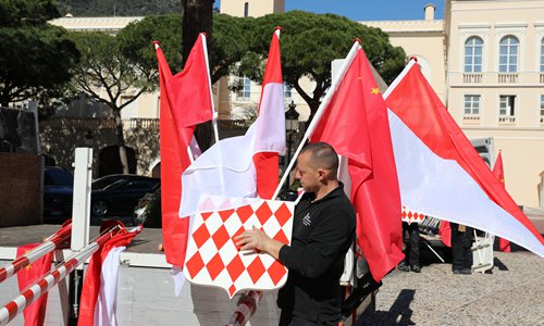 A Monegasque worker prepares national flags of China and Monaco at the square of the Prince's Palace of Monaco on Sunday ahead of Chinese President Xi Jinping's visit to the country. Photo: Li Zhiwei