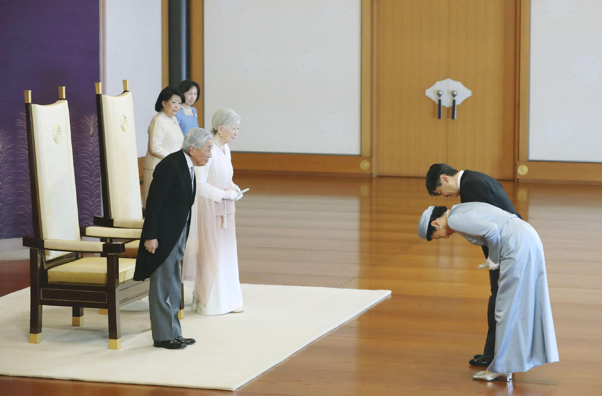 Japan's Emperor Akihito and Empress Michiko receive the greetings of Crown Prince Naruhito and Crown Princess Masako as a part of the ceremony marking 30th anniversary of Emperor Akihito's jubilee at the Imperial Palace in Tokyo, Japan, Feb 24, 2019. [Photo/Agencies]