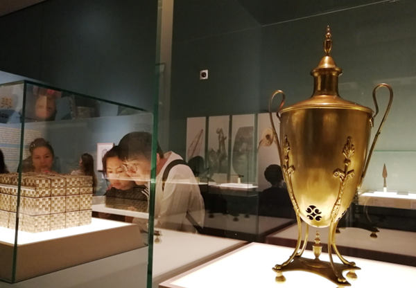 Visitors watch cultural relics from Russia at the exhibition. (Photo/People’s Daily Online)