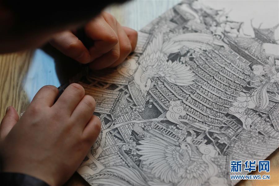Lan Caisheng draws a Dong village drum tower in his studio, April 14. (Photo/Xinhua)