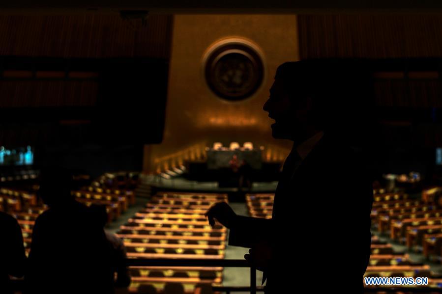 United Nations tour guide Oliver Marsh speaks to tourists at the UN headquarters in New York, April 17, 2019. Oliver Marsh, a New Yorker, is a Chinese-speaking tour guide at the visitor center of the UN headquarters. In February, when Chinese visitors peaked at the UN headquarters during the Spring Festival holidays, Marsh started guiding Chinese language tours. He is now the only Chinese-speaking tour guide at the visitor center whose native language is not Chinese. (Xinhua/Li Muzi)