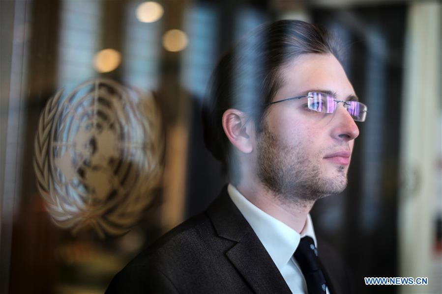 United Nations tour guide Oliver Marsh poses for a photo at the UN headquarters in New York, April 17, 2019. Oliver Marsh, a New Yorker, is a Chinese-speaking tour guide at the visitor center of the UN headquarters. In February, when Chinese visitors peaked at the UN headquarters during the Spring Festival holidays, Marsh started guiding Chinese language tours. He is now the only Chinese-speaking tour guide at the visitor center whose native language is not Chinese. (Xinhua/Li Muzi)