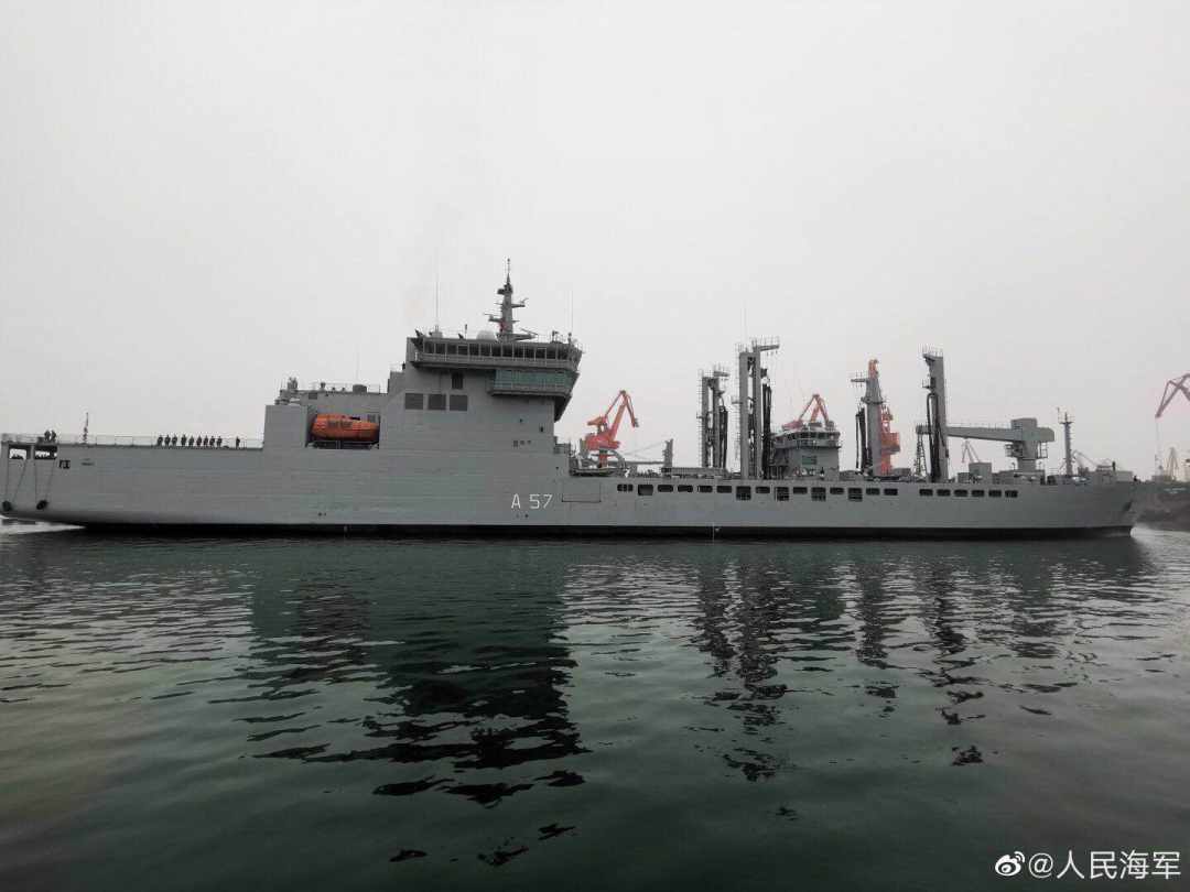 Indian supply ship INS Shakti (A57) arrives in Qingdao on April 21. (Photo/ PLA Navy’s Weibo account)