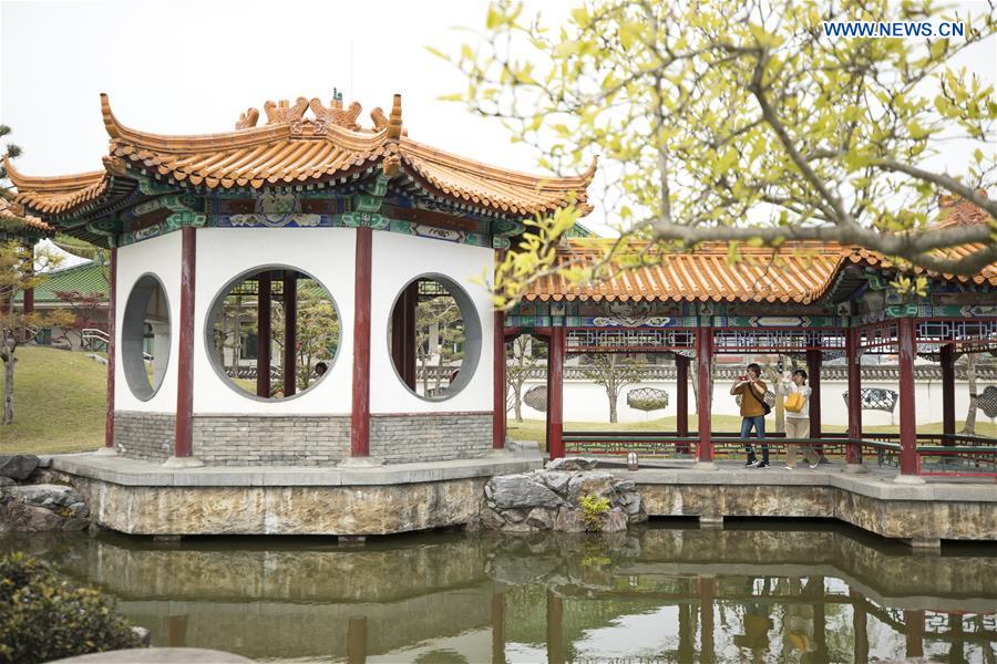 Tourists visit the Encho-en garden in Tottori, Japan, April 18, 2019. Covering an area of about 10,000 square meters, Encho-en is one of the biggest full-scaled Chinese-style garden in Japan. It was built in 1995 to show the friendship between Tottori and north China's Hebei Province. The designing and materials procurement and processing took place in China. The main building was shop-assembled in China before the final assembly in Japan. All these steps were supervised by Chinese engineers. (Xinhua/Du Xiaoyi)