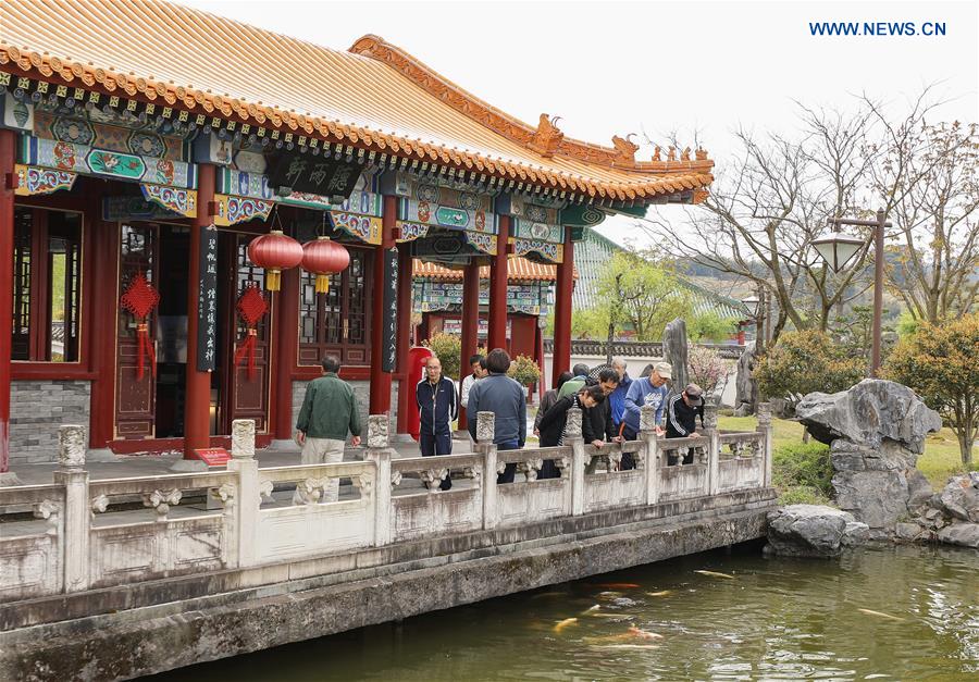 Tourists visit the Encho-en garden in Tottori, Japan, April 18, 2019. Covering an area of about 10,000 square meters, Encho-en is one of the biggest full-scaled Chinese-style garden in Japan. It was built in 1995 to show the friendship between Tottori and north China's Hebei Province. The designing and materials procurement and processing took place in China. The main building was shop-assembled in China before the final assembly in Japan. All these steps were supervised by Chinese engineers. (Xinhua/Du Xiaoyi)