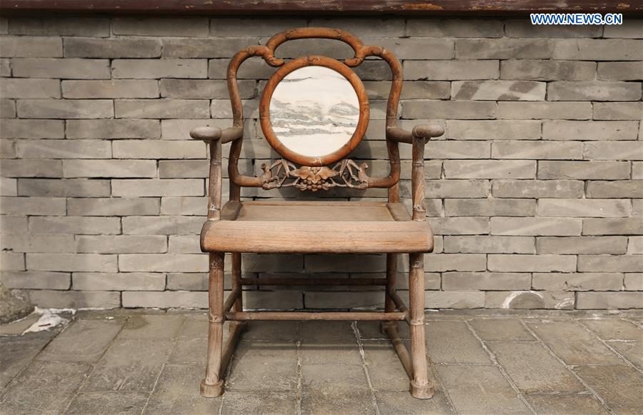 Photo taken on April 18, 2019 shows a chair at the Encho-en garden in Tottori, Japan. Covering an area of about 10,000 square meters, Encho-en is one of the biggest full-scaled Chinese-style garden in Japan. It was built in 1995 to show the friendship between Tottori and north China's Hebei Province. The designing and materials procurement and processing took place in China. The main building was shop-assembled in China before the final assembly in Japan. All these steps were supervised by Chinese engineers. (Xinhua/Du Xiaoyi)