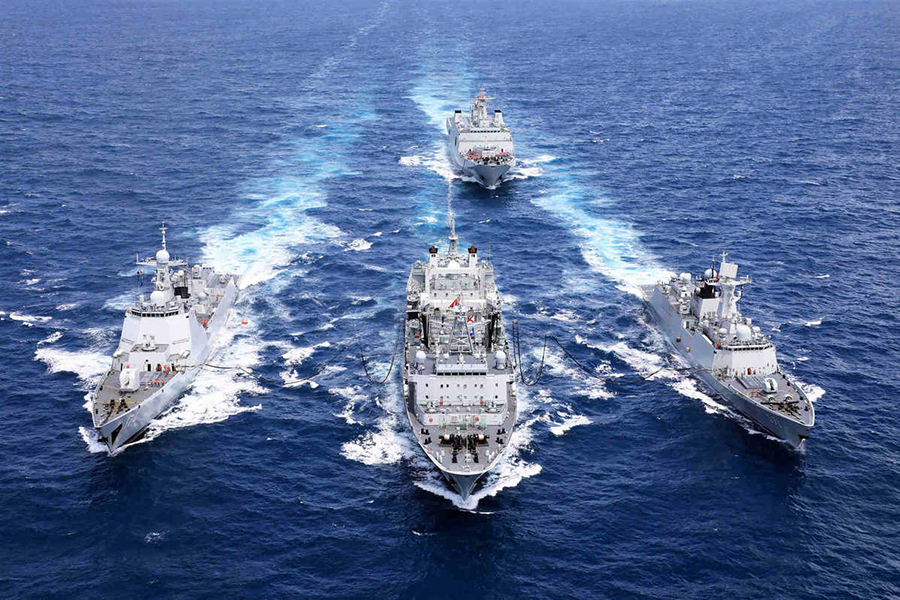 PLA Navy ships conduct supply operations at an unspecified location in February. [Photo/Xinhua]