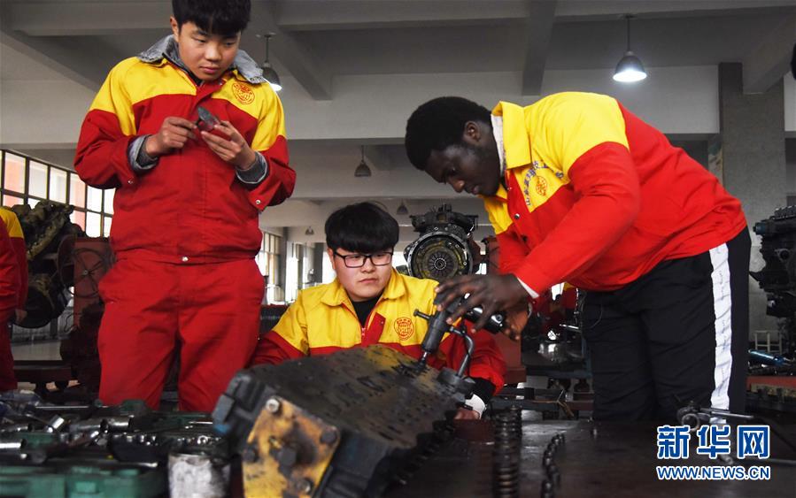 Liu Yang (first from right) studies mechanics with his classmates on Feb. 26. (Photo/Xinhua)