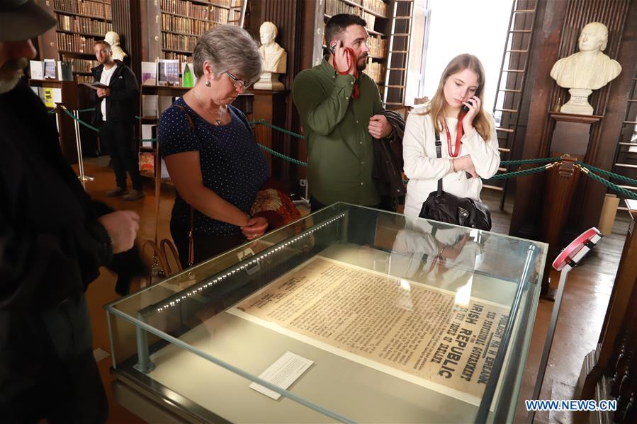 People view a copy of the 1916 Proclamation of the Irish Republic displayed in the Library of Trinity College Dublin in Dublin, Ireland, on the World Book Day, April 23, 2019. Hundreds of local residents and tourists visited the Library of Trinity College Dublin on the World Book Day, which falls on April 23 every year. (Xinhua)