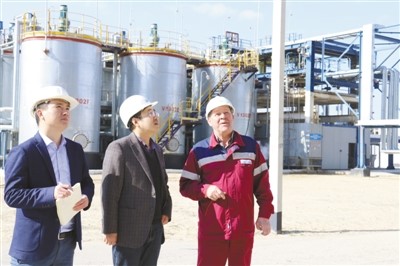 Photo shows Chinese and Kazakh engineers discussing operation of an asphalt plant in Aktau, Kazakhstan. The plant is the biggest cooperation project of China and Kazakhstan in the non-resource sector. (Photo by Zhou Hanbo/People’s Daily)
