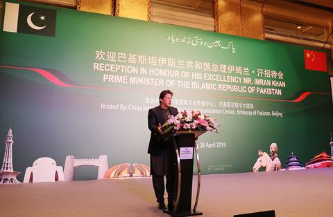 Pakistani Prime Minister Imran Khan addresses the reception in his honor, April 26, 2019. (Photo: Long Ren)